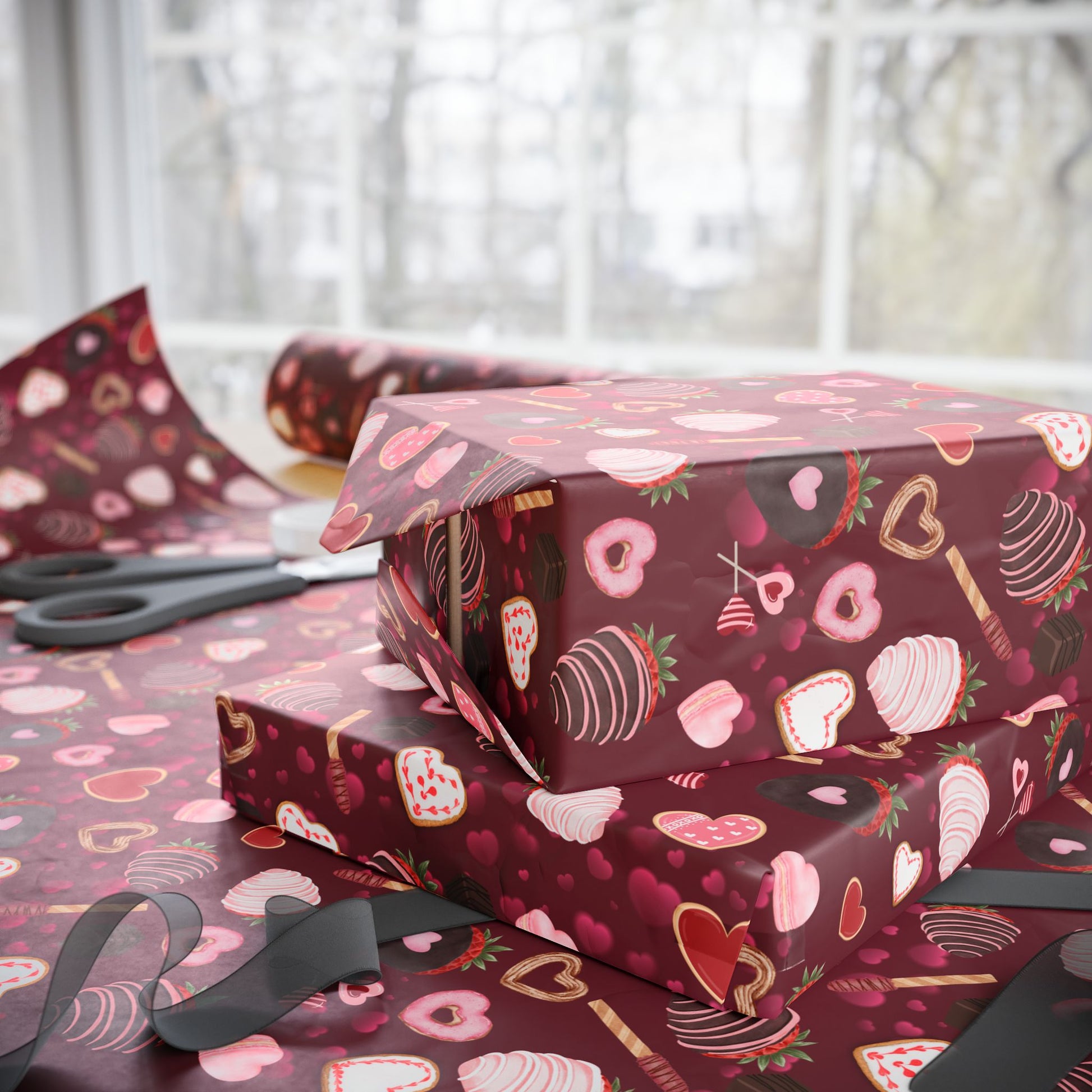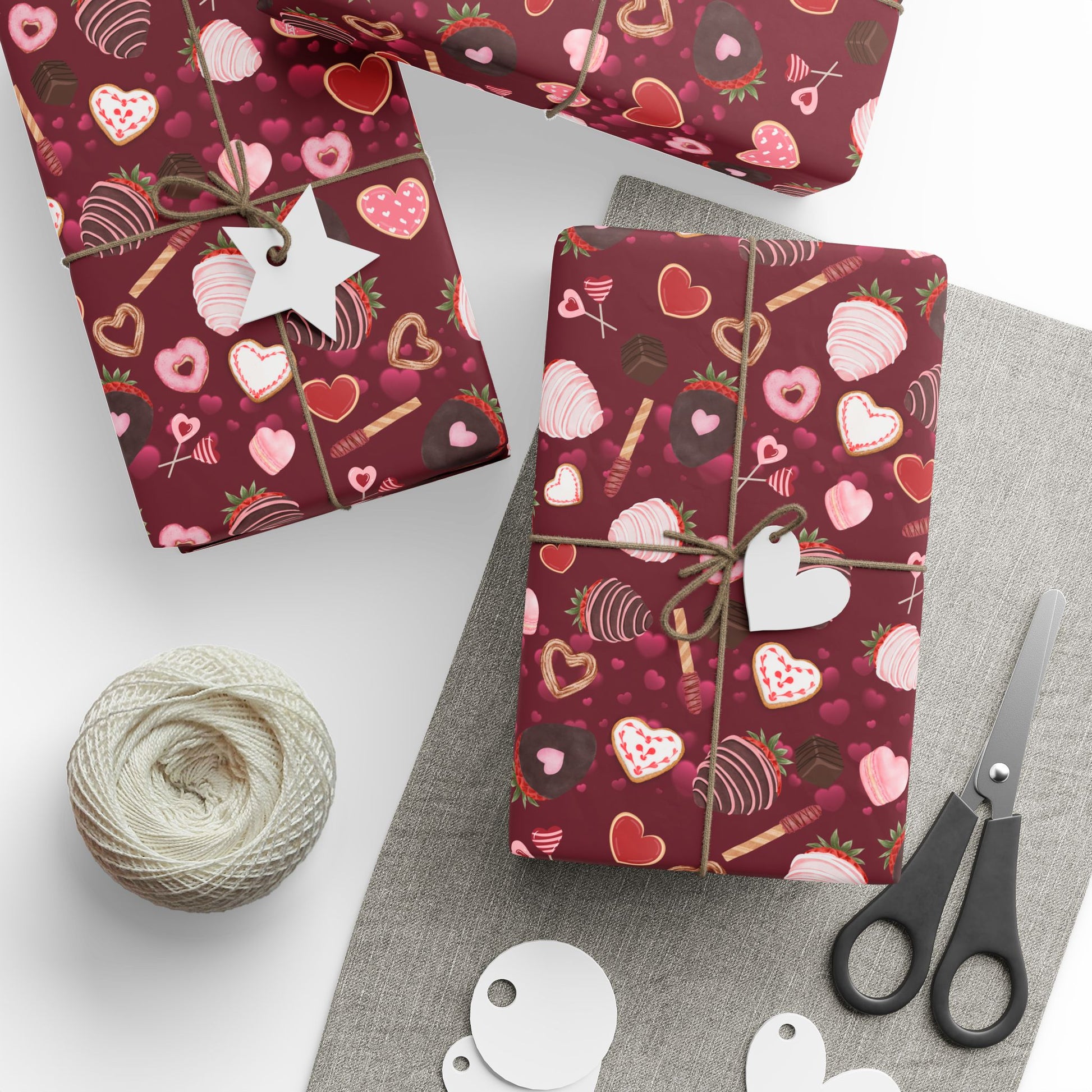 Sweet, playful gift wrap printed with sweets motifs. Each sheet carries a nostalgic, confectionery vibe — think sugared hearts, Chocolate Covered Strawberries, and little heart pop cakes — that turns ordinary presents into moments that feel fun and heartfelt. Use it when you want the unwrapping to start the smile: Valentines, birthdays, bridal showers or anytime you want to send a small, joyful surprise that reads like a love note.