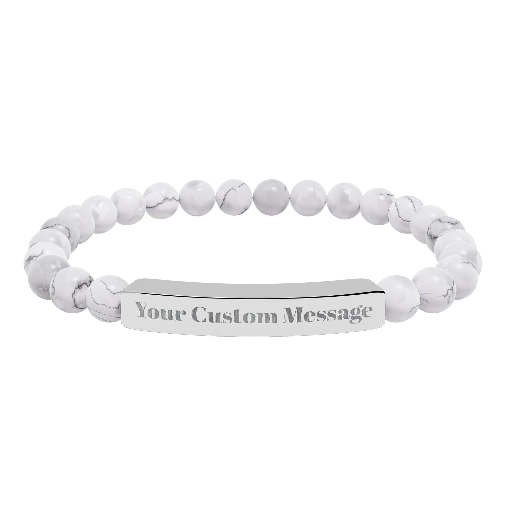 Put your name or message from the heart on fun and stylish bracelets. A calm, wearable reminder wrapped around the wrist. These stretch stone bracelets pair smooth, natural beads with a slim engraved stainless steel bar — understated, personal, and quietly durable. The beads bring warm, earthy tones or soft marbled white to everyday outfits, while the engraved plate holds a name, date, or short phrase that stays crisp over time. Lightweight and hypoallergenic, the bracelet slips on easily and feels like part of you, whether layered with other pieces or worn alone during moments that matter.