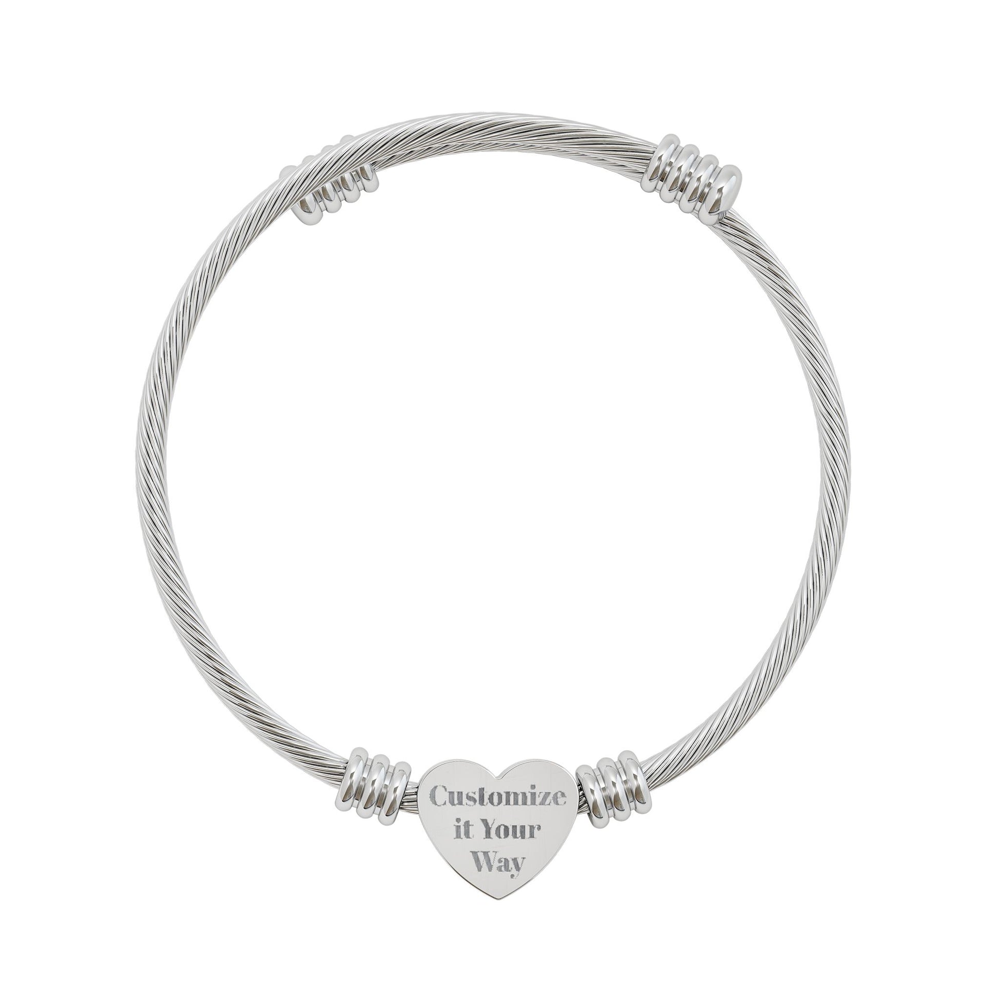 Customize it Your Way, A slender heart cuff bracelet that reads like a quiet promise. The braided cable band hugs the wrist with gentle tension, while the small heart charm sits centered—ready for a name, date, or short message to be engraved. Lightweight and low-profile, it layers easily with other jewelry or stands alone as a subtle statement. The polished finish and surgical-grade construction keep the shine where you want it, while the included white gloss box and non-tarnish cotton make it feel cared for from unboxing to everyday wear.