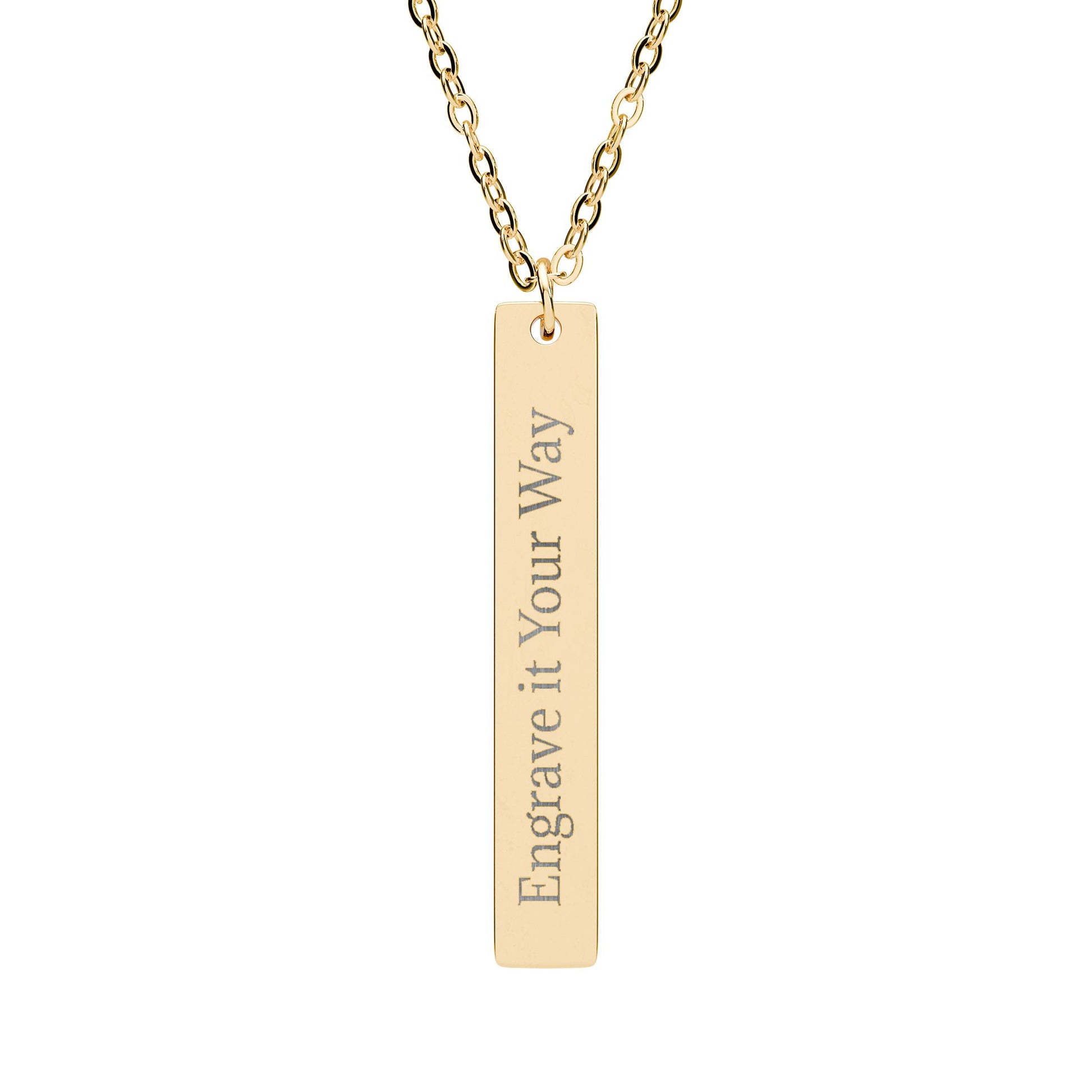 Ready to Customize it Your Way. A slim vertical bar necklace with a quiet, confident presence. The surgical-grade stainless steel bar hangs from a delicate chain, its laser-engraved message etched deep enough to stay sharp through daily wear. Lightweight and hypoallergenic, it settles close to the collarbone and carries meaning without shouting. Wear it alone for a minimalist look or layer with other chains to create a personal stack that tells your story.