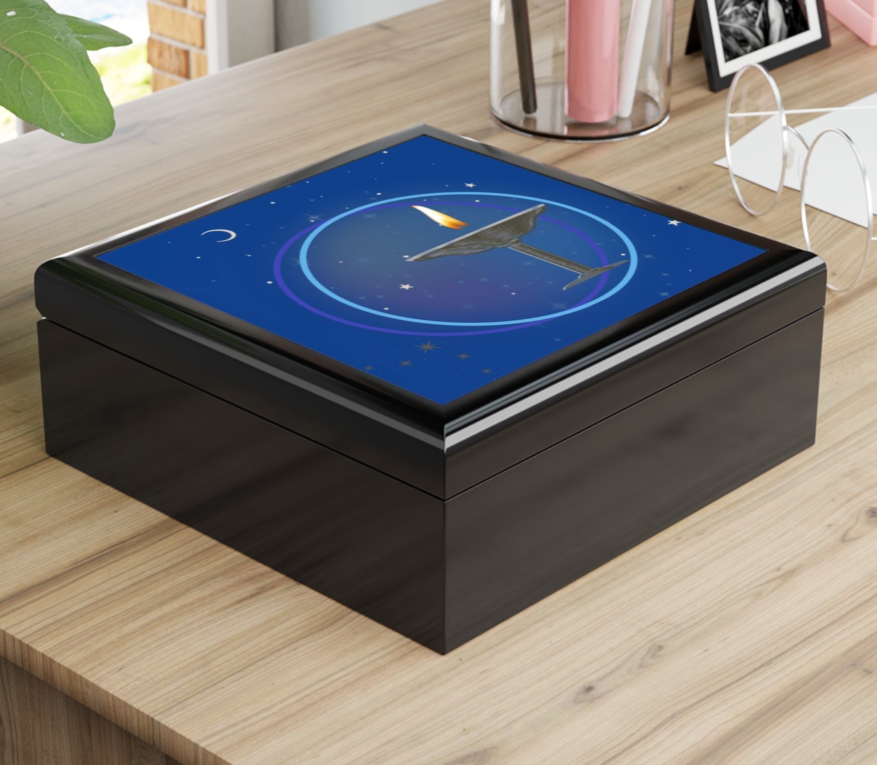 This Flaming Chalice Jewelry Box glossy wooden jewelry box carries a quiet, contemplative mood. A deep-blue ceramic tile on the lid shows a candlelit chalice framed by soft rings and a crescent moon — a small scene that invites slow moments and personal rituals. The varnished rubberwood body reflects light cleanly, while the soft felt interior cradles rings, necklaces, and keepsakes. Dual hinges hold the lid open at a steady 90°, and a slip-resistant felt base keeps the box steady on dressers and vanities. It’s the kind of piece that becomes part of a nightly routine: set it down, open it, lift out a treasured item, and pause for a breath.