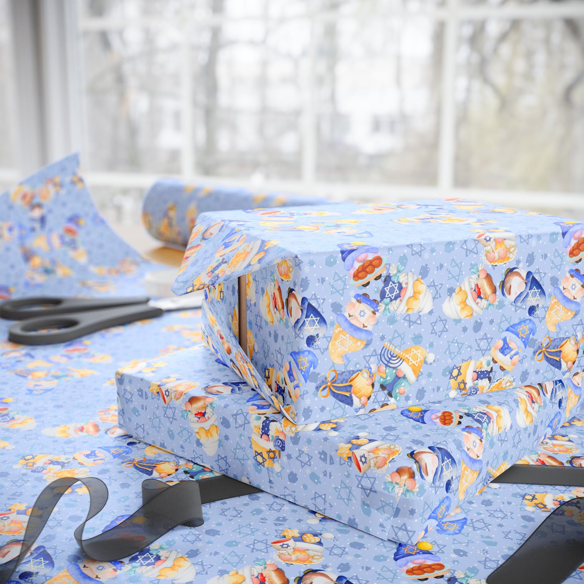 Gnomeukkah themed wrapping paper featuring cute Jewish inspired gnomes, perfect for holiday gift wrapping. Adds a fun and festive touch to your presents. Ideal for those celebrating Hanukkah or looking for unique holiday wrapping options.